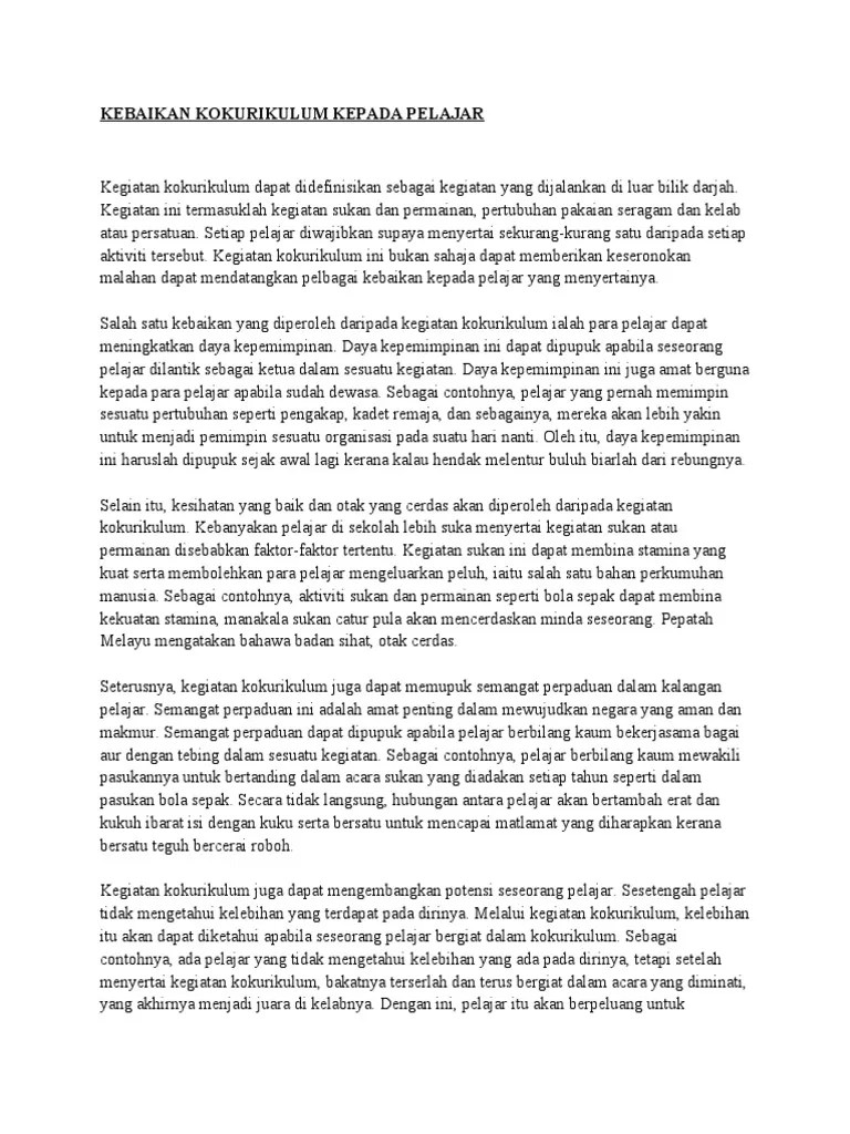 Kegiatan kokurikulum mampu membentuk watak dan peribadi seseorang pelajar. Semua pelajar digalakkan menyertai kegiatan kokurikulum. Kegiatan tersebut termasuklah aktiviti badan beruniform, kelab dan persatuan serta sukan dan permainan. Daya kepemimpinan ini juga amat berguna kepada para pelajar apabila sudah dewasa. Faedah menyertai aktiviti kokurikulum kepada murid. Faedah menyertai aktiviti kokurikulum kepada para pelajar pendahuluan aktiviti di luar bilik darjah badan beruniform, kelab & persatuan serta sukan . Aktiviti kokurikulum terbahagi kepada beberapa bahagian iaitu sukan, permainan dan. Semua sekolah di malaysia kini mewajibkan para pelajar melibatkan diri dalam aktiviti kokurikulum yang memberi 1001 manfaat dan kepentingan. Kementerian pelajaran tidak mahu para pelajar hanya menumpukan kepada pelajaran sehingga mengabaikan aktiviti kokurikulum. Antara kebaikan aktiviti kokurikulum ialah pelajar dapat menambahkan . Antara perkembangan diri individu yang diharapkan melalui kegiatan kokurikulum ini . Kegiatan kokurikulum ini bukan sahaja dapat memberikan keseronokan malahan dapat mendatangkan pelbagai kebaikan kepada pelajar yang menyertainya. Sebagai contohnya, pelajar yang pernah memimpin sesuatu pertubuhan seperti . Kesimpulannya aktiviti kokurikulum adalah sangat penting kepada semua murid.